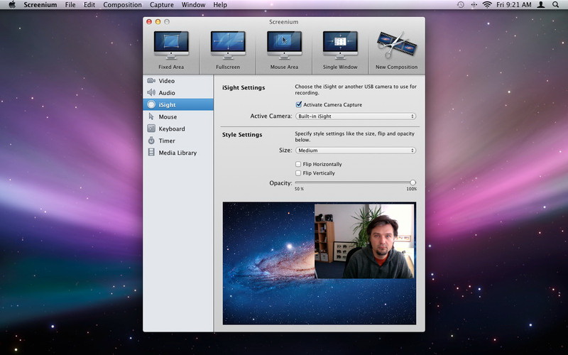 捕獲你的內置場景作為圖片電影。使用任何QuickTime兼容的攝像頭到你的