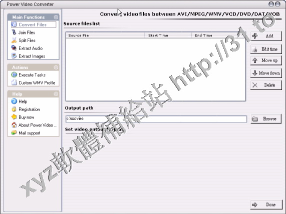 SVCD、DVD、WMV、ASF、DAT、VOB等文件格式之間進行轉換,轉換快速,界面友好。